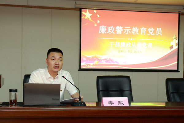 隨后,黨委書記李政為全體黨員上了一堂廉政專題黨課。從4個方面講述了認清反腐倡廉、嚴守規(guī)矩、正風肅紀的重要性和急迫性,一是認識新形勢反腐敗斗爭的形勢,二是腐敗出現的原因和防范措施,三是學習廉潔法律法規(guī),防范廉潔風險,四是增強黨員領導干部拒腐防變的能力。并對公司的黨風廉政和反腐倡廉工作提出要求,在國企,不要想著賺大錢;做事情,以企業(yè)利益為先;要形成求真務實、清正廉潔的新風正氣。