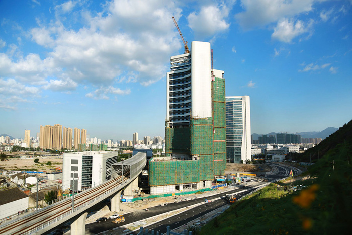 牛山國際四期工程東側(cè)為牛山中路,西南側(cè)為西站東路,市域鐵路S1線貫穿其中。冶煉公司和施工單位積極響應(yīng)市委市政府號召,全力支持市域鐵路S1線施工建設(shè),導(dǎo)致前期牛山國際四期工程工期嚴重滯后。同時按照相關(guān)規(guī)定要求,市域鐵路S1線于2018年10月1日試運行后,臨近S1線一側(cè)的10層以上高度的外立面不得施工,橫跨軌道上方的塔吊塔臂必須拆除。